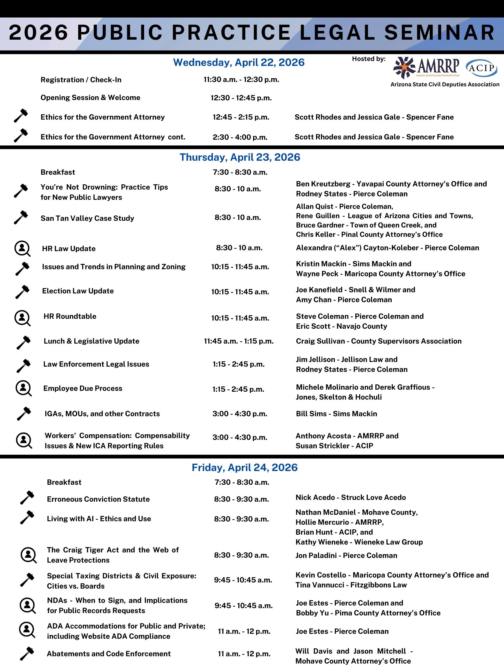 Arizona’s public and private practice attorneys and HR professionals are invited to join us for the 2026 Public Practice Legal Seminar & HR Summit, a three‑day gathering focused on the latest issues impacting cities, towns, and counties across the state!